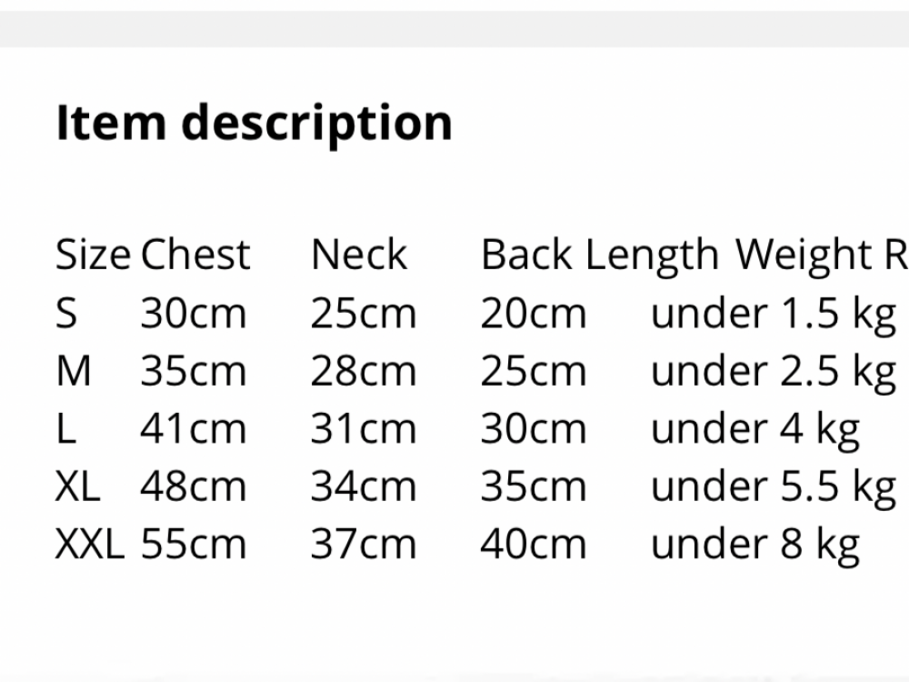 الصدر: 48 سم، الرقبة: 34 سم، طول الظهر: 35 سم