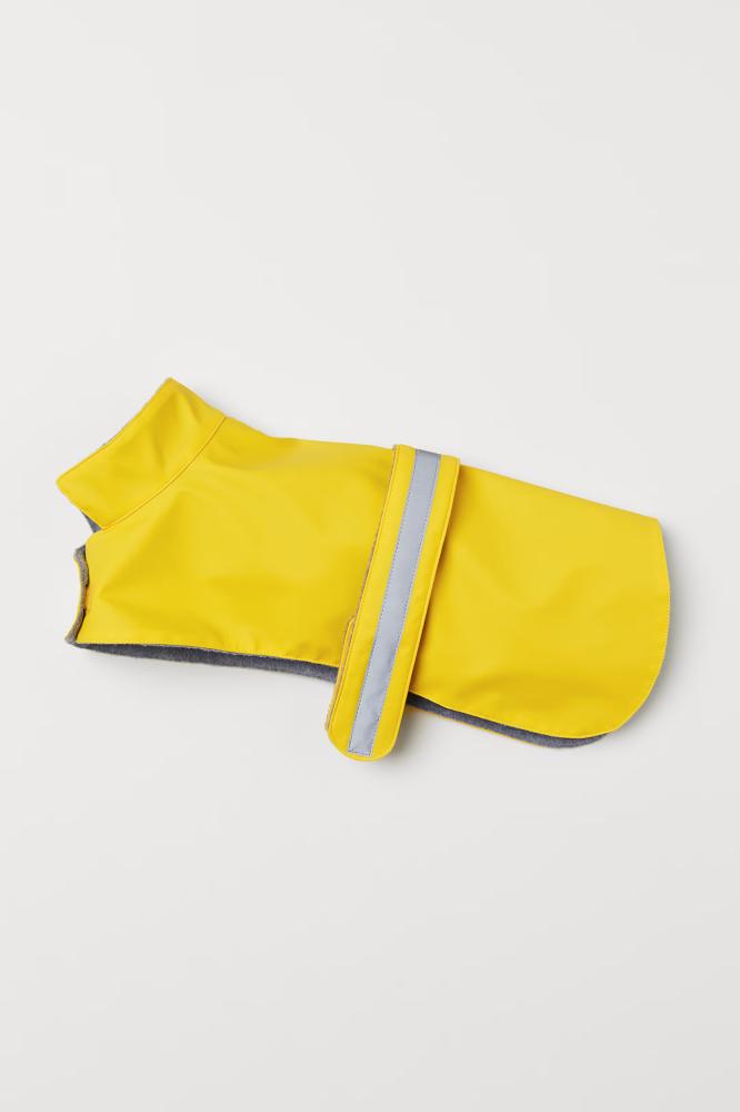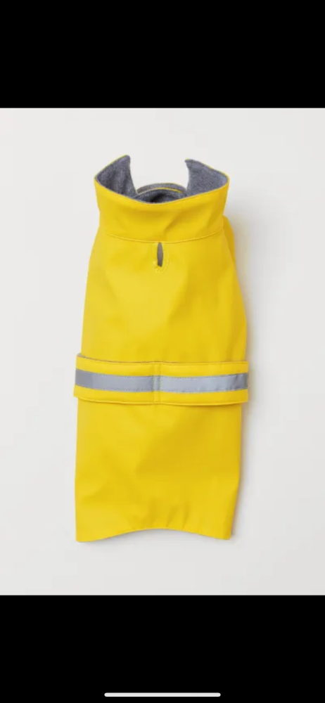 Rain jacket designed to fit a small dog with a collar, hole for a lead and a hook and loop fastening at the neck. Belt with reflective strips