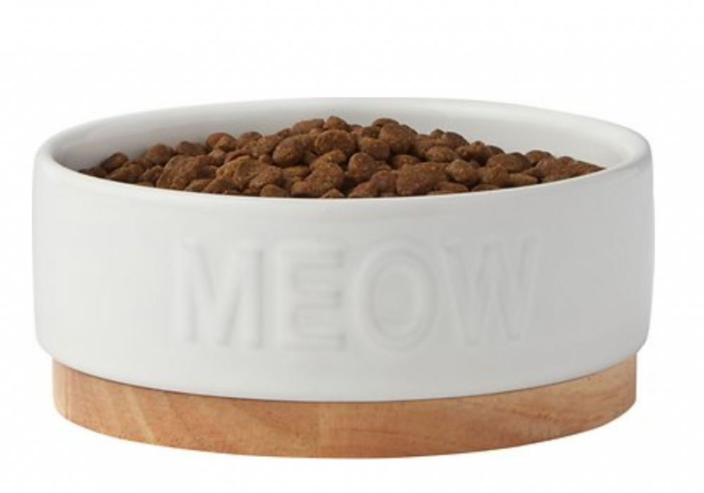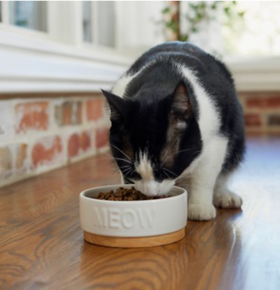 وعاء دائري من السيراميك الأبيض للحيوانات الأليفة مع رسم "مواء" لطيف على الجانب.